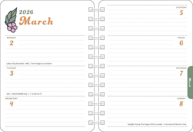 Words of inspiration such as "Take your dreams seriously," "Be open to whatever comes next," and "You are a part of the beauty of this world" are paired with groovy illustrations of flowers, butterflies, mushrooms, and mandalas. The monthly and weekly spreads offer ample room for planning, making lists, and noting all the important things. After all, as the cover says, "It's all about balance, baby!"