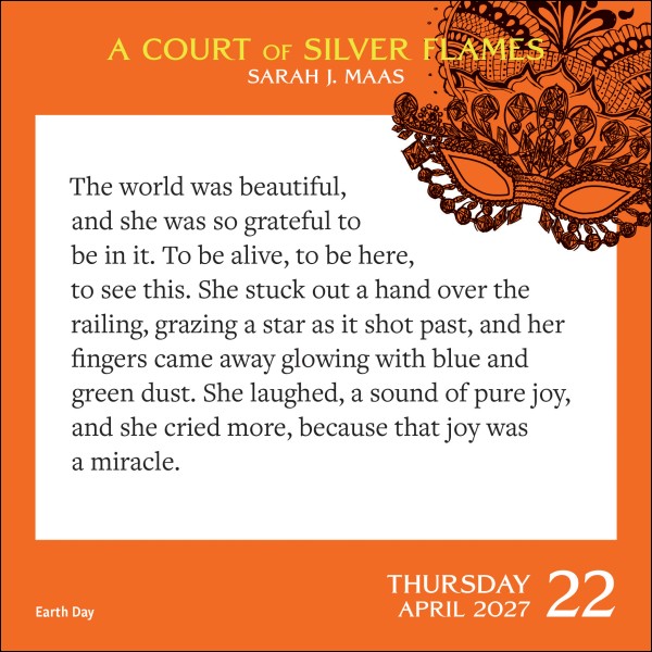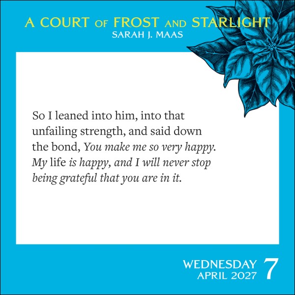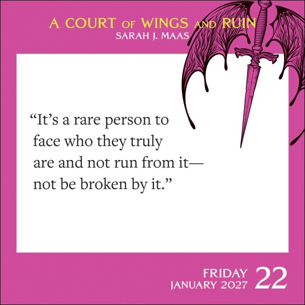 Each page of this daily desk calendar features a different quote from one of the books in Sarah J. Maas's explosively seductive bestselling series, A Court of Thorns and Roses. Perfect for fans of the series, avid romantasy readers, and spicy literature lovers, this calendar would make a great stocking stuffer or desk decoration. From Illyrian warriors training stubborn Fae, to smoldering High Lords sending messages down the bond, come get lost in the beautiful, dangerous world of Prythian.