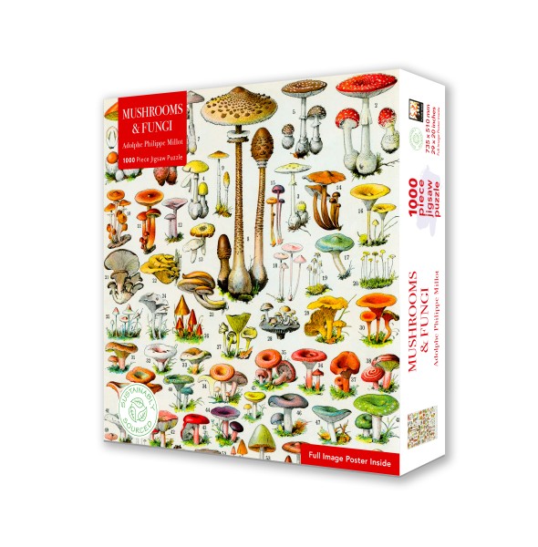 Part of a new, exciting series of ethical, sustainable and earth-friendly jigsaw puzzles that feature powerful and popular works of art. This high-quality, 1000-piece jigsaw puzzle from Flame Tree is made with all FSC-certified paper, board and bag, with sturdy pieces and no shrink-wrap. The 1000 pieces will satisfy your need for a challenge, with the wonderfully intricate Mushrooms illustration by Adolphe Philippe Millot originally created for the classic encyclopedias published by Larousse. Intended for adults and children over 13 years. Not suitable for children under 3 years due to small parts. Includes an A4 poster for reference. Finished Jigsaw size 735 x 510mm / 29 x 20 ins.