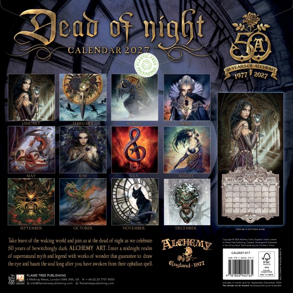 Alchemy England is a pioneering British lifestyle brand, globally acclaimed since 1977 for its iconic designs that embody the spirit of alternative culture. This richly illustrated art calendar brings together 12 fabulous, darkly romantic, gothic and fantasy artworks from Alchemy, from femmes fatales and dragons' lairs to omens of death and sinister serpents, all with the mesmerising Alchemy quality, skill and atmosphere. And this year celebrates 50 Years of Alchemy. With a beautiful datepad design and first page including September–December 2025. Printed on FSC-certified paper, with plastic-free packaging.