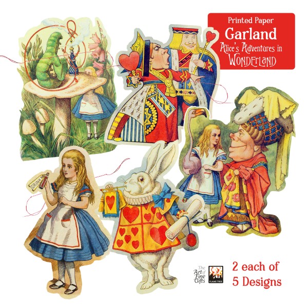 Part of a delightful new series of beautiful paper garlands that feature art by popular artists. Ideal for decorating mantelpieces, windows and walls around the house, for parties, celebrations or simply brightening up your home. The 10 cutout shapes (2 x 5 designs), made from thick FSC-certified art card and printed in colour with stunning foiled detailing on both sides, are sewn onto a strong 3m-long thread, looped at either end for ease of hanging. This set shows off a selection of Tenniel's beloved illustrations, coloured for the shortened version of Lewis Carroll’s Alice’s Adventures in Wonderland (1865), The Nursery "Alice" (1889–90): Alice, The Queen and King of Hearts, the White Rabbit, the Caterpillar and The Duchess.