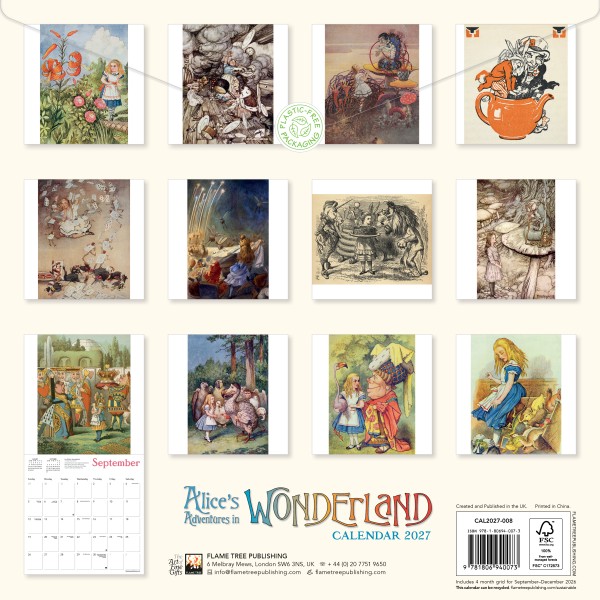From its publication in 1865, Lewis Carroll's Alice's Adventures in Wonderland captured the imagination of readers of all ages, and whimsical world of Alice has continued to inspire artists for generations. This wall calendar showcases 12 iconic scenes by illustrators including John Tenniel, Arthur Rackham and more. Each work is accompanied by informative text and the datepad features previous and next month’s views. Printed on FSC-certified paper, with plastic-free packaging.