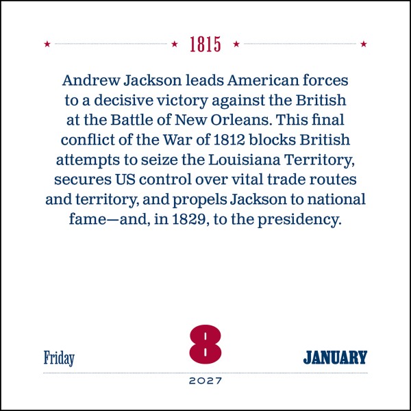 The Boston Tea Party, Prohibition, the Kennedy Assassination, Lewis & Clark, the Space Race: how well do we know the stories that made America? The official American History Tellers 2027 Day-to-Day Calendar presents key historical events that have shaped—and continue to shape—the nation.