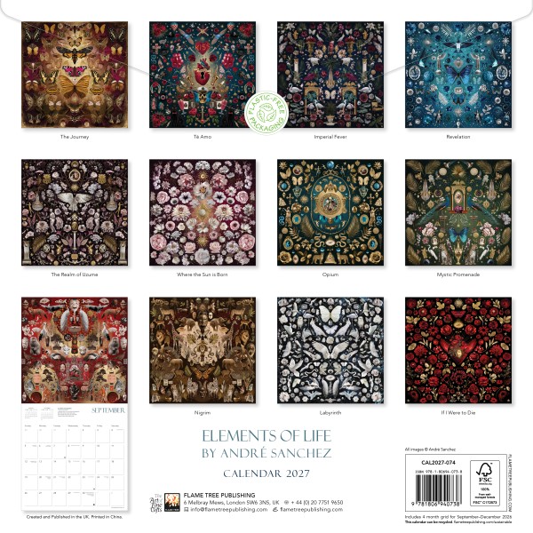 André Sanchez is a French artist specializing in digital collage. His unique universe blends dreamlike imagery, symbolism, and baroque influences. Inspired by art history, nature, and mythology, he creates lush worlds where animals, mysterious figures, and imaginary landscapes meet. With a selection of 12 delightful artworks, this calendar showcases his unique skill and vision. Informative text accompanies each work, and the datepad features previous and next month’s views. Printed on FSC-certified paper, with plastic-free packaging.