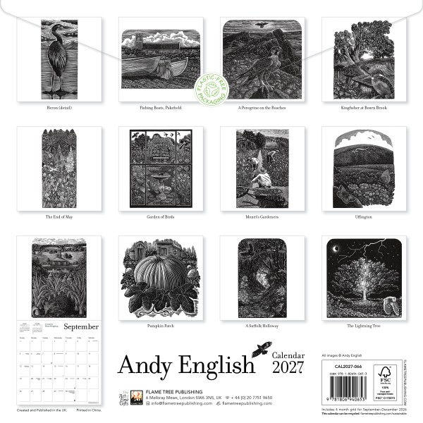 This beautiful calendar showcases 12 evocative prints by rural Cambridgeshire-based artist Andy English. Andy's work developed from a lifelong habit of making detailed observational drawings, which led him to the exacting art of wood engraving. Wildlife, gardens and landscapes feature strongly in his work, and bees and birds often inhabit the prints, which are printed using a Victorian handpress and have been used in book illustrations and postage stamps, as well as for exhibition. Fascinating words form the artist himself accompany each work and the datepad features previous and next month’s views. Printed on FSC-certified paper, with plastic-free packaging.