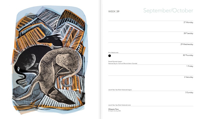 Printmaker and illustrator Angela Harding trained in Fine Art at Leicester Polytechnic and Nottingham Trent University. She now lives in the UK’s smallest county, Rutland, where she works from her garden studio in Wing. She is inspired by the wealth of natural wildlife around her to create her stunning prints. Showcasing more than 30 of her incredible artworks, this delightful week-to-view desk diary, printed on FSC-certified paper, is a charming gift or a treat for yourself.