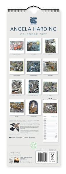 Printmaker and illustrator Angela Harding trained in Fine Art at Leicester Polytechnic and Nottingham Trent University. She now lives in the UK’s smallest county, Rutland, where she works from her garden studio in Wing. She is inspired by the wealth of natural wildlife around her to create her stunning prints. This charming slim calendar features beautiful reproductions of some of her best works. The animals she depicts are always featured in atmospheric locations which pull the viewer into the artwork. Printed on FSC-certified paper, with plastic-free packaging.