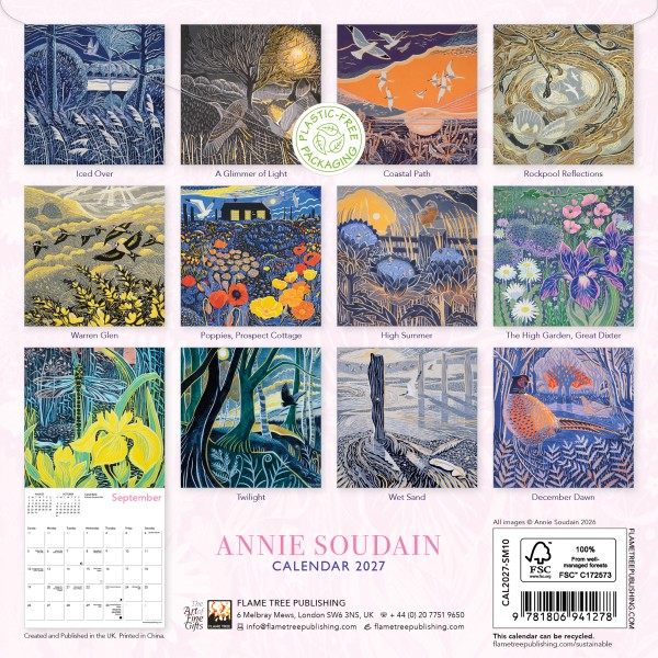 A member of Sussex Guild and the Rye Society of Artists, Annie Soudain has always been inspired by nature. She uses a variety of media to create her beautiful artworks, but her main focus is on linoprinting. This calendar showcases 12 of her beautiful works. The datepad in this mini wall calendar features previous and next month’s views. Printed on FSC-certified paper, with plastic-free packaging.