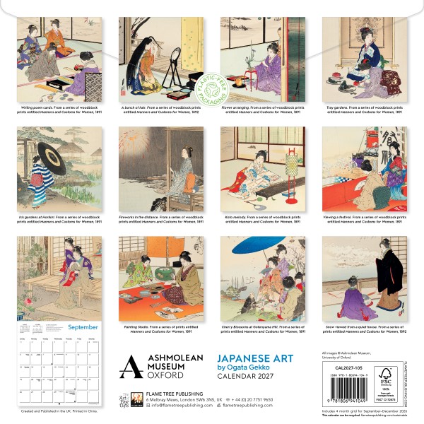 With 12 exquisite prints by Japanese artist Ogata Gekkō, this calendar showcases the detail found in Japanese art from the Ashmolean Museum’s incredible collections. The original Ashmolean Museum opened in 1683 as Britain’s first public museum, and the world’s first university museum. Today, the Ashmolean Museum of Art and Archaeology houses Western Art, Eastern Art, Antiquities, Cast Gallery and the Coin Room. Informative text accompanies each work and the datepad features previous and next month’s views. Printed on FSC-certified paper, with plastic-free packaging.