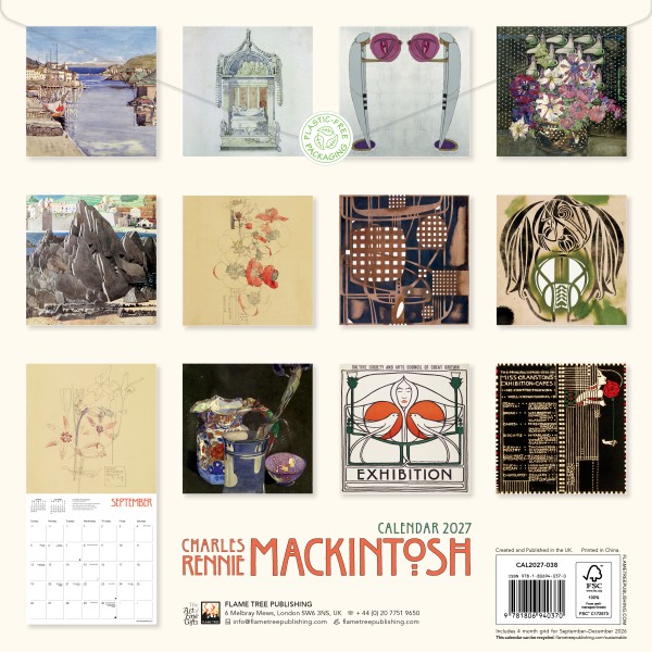 Charles Rennie Mackintosh was a major influence on the architecture and design of the twentieth century. A gifted artist, designer, craftsman and architect, he is one of the key figures of the Arts & Crafts Design Movement in Britain and the flourish of Art Nouveau in Scotland. As part of a group of artists known as ‘The Four’, he helped develop the ‘Glasgow’ style. Informative text accompanies each work and the datepad features previous and next month’s views. Printed on FSC-certified paper, with plastic-free packaging.
