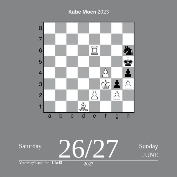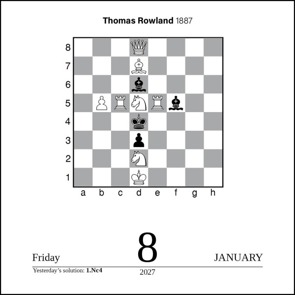 The ideal gift for chess players of every level! Challenge yourself with problems of varying difficulty by the week, every day of the year --chosen specially for the calendar by the editors of American Chess Magazine, and the answer to each puzzle is printed on the following page.