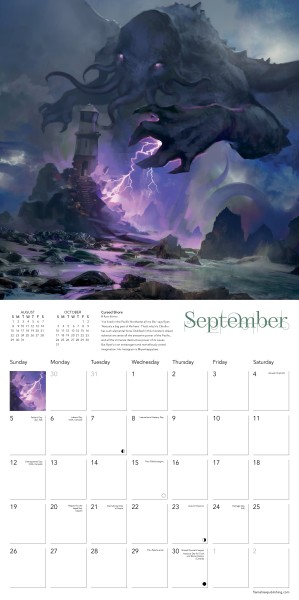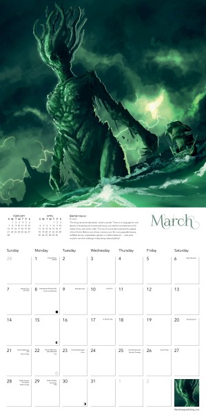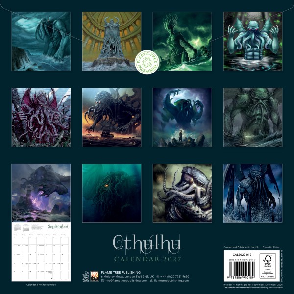 Appearing in several of H.P. Lovecraft’s works, kraken-like monster Cthulhu is an iconic figure that has fed imaginations and terrified generations. Its name has come to define the whole mythos built up around Lovecraft’s strange worlds and pantheon of monsters that continue to inspire many writers. Featuring the fantastic work of talented artists, this calendar displays a fascinating mix of weird and wonderful depictions of this notorious monster that lurks beneath the deep. The datepad features previous and next month’s views. Printed on FSC-certified paper, with plastic-free packaging.