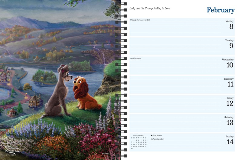 The Disney Dreams Collection by Thomas Kinkade Studios 2027 Engagement Calendar lays flat when open to any page and features a storage pocket inside the front and back covers. It includes years and months-at-at-a-glance for reference as well as weekly planning pages to keep track of appointments, deadlines, and special occasions. There are also pages in the back for notes and contacts.