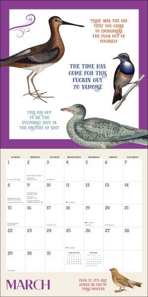 - Each monthly spread features vintage bird artwork paired with sweary sayings