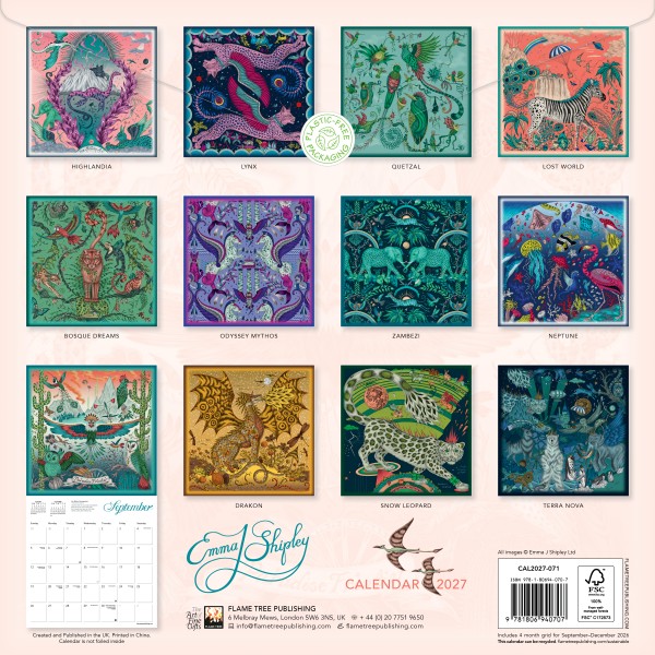 Emma J Shipley is a British graphic artist known for her intricately detailed, hand-drawn designs that blend the beauty of nature’s wildest places with her vivid imagination. Taking inspiration from the untamed landscapes of South America’s jungles and Africa’s savannahs, Emma combines these natural wonders with influences from myths, legends, and fairy tales, creating a unique and fantastical world of design. Her work invites nature lovers, dreamers, and maximalists to transform their world with a touch of magic. This wall calendar features 12 images showcasing her distinctive style. Informative text accompanies each work in this art calendar and the datepad features previous and next month’s views. Printed on FSC-certified paper, with plastic-free packaging.