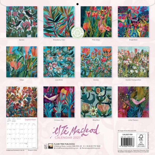 Esté MacLeod’s paintings are informed by the real and the imaginary. The variety of techniques Esté uses to layer colour and shapes adds an ethereal element to her work and this wonderful wall calendar brings together a vibrant selection of 12 of her artworks. Her background in textile and ceramic design is noticeable in the stylised, abundant and colourful forms used in her paintings. The datepad features previous and next month’s views. Printed on FSC-certified paper, with plastic-free packaging.