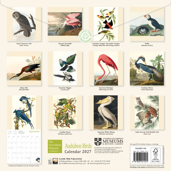 John James Audubon (1785–1851) was an American ornithologist and painter. He carried out extensive studies into the natural world and documented his findings through his detailed illustrations. Drawing from the Fitzwilliam Museum's extensive collection, this calendar showcases 12 of his illustrations from Birds of America, published between 1827 and 1838, which is considered to be his most impressive accomplishment. Informative text accompanies each work and the datepad features previous and next month's views. Printed on FSC-certified paper, with plastic-free packaging.