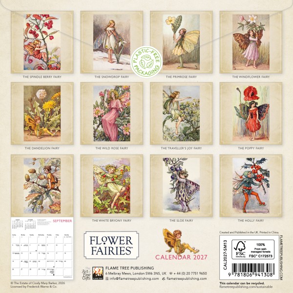 Since their first publication in 1923, Cicely Mary Barker’s Flower Fairies have enchanted both adults and children alike around the world. The botanically accurate drawings in the original illustrations, coupled with the enchanting fairy images based on real children from Cicely’s sister’s nursery school, appeal to our innate sense of magic and wonder. This wall calendar brings together a selection of Cicely's original artwork that any fan of fairies will love, accompanied by extracts from Cicely's original verse written specially for each fairy. The datepad features previous and next month’s views. Printed on FSC-certified paper, with plastic-free packaging.