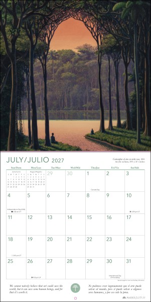 Gathered in a wall calendar for the first time, the soulful and hyper-detailed jungle paintings of contemporary Cuban artist Tomas Sánchez transport the viewer to dreamlike glades, mysterious riverbanks, and silent islands, where it's impossible not to feel stress and strife melt away on the sound of wind through leaves or the rush of water. This bilingual English/Spanish calendar presents twelve of Sánchez’s most popular works paired with quotes from the artist about meditation.
