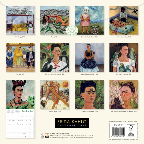 Now regarded as a feminist and LGBT icon, as well as a key artist during the twentieth century, Frida's life story is shown within every inch of her art. Disabled by polio as a child, and later her involvement in a serious road traffic accident, Frida Kahlo took up painting, firstly as therapy due to her long recovery, and then as a career choice. Her work is mostly from her own, oftentimes painful experiences, as a result of both the accident and the personal and abusive relationship with her husband, Diego Rivera, another artist. Informative text accompanies each work and the datepad features previous and next month’s views. Printed on FSC-certified paper, with plastic-free packaging.