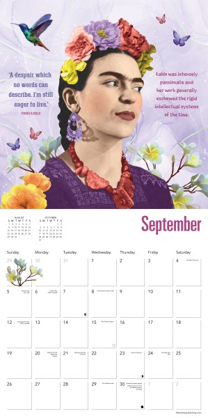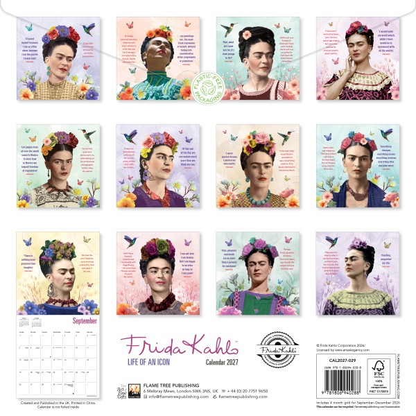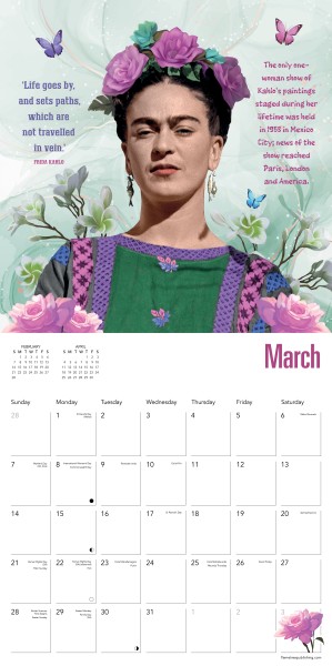 Mexican artist Frida Kahlo sought to define her identity, as well as that of Mexico. She explored themes of self-identity, gender, postcolonialism and popular culture from Mexico throughout her works. Now regarded as a feminist and LGBT icon, as well as a key artist during the twentieth century, this calendar celebrates Frida Kahlo’s life with beautiful portraits. The datepad features previous and next months views. Printed on FSC-certified paper, with plastic-free packaging.