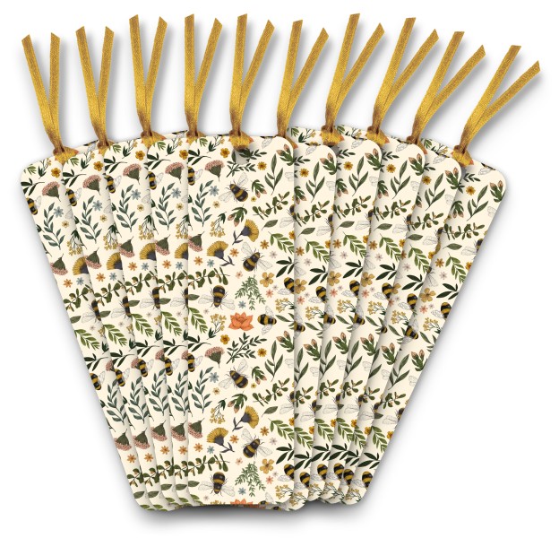 Sold in packs of 10. Keep the page in your book with this gorgeous foiled bookmark, printed on both sides, with a silky ribbon and featuring Jade Mosinski's Garden Bees. FSC-certified.