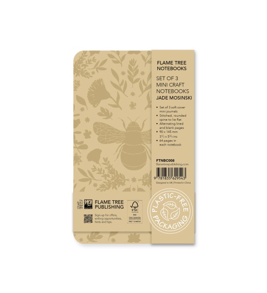 The Jade Mosinski Set of 3 Mini Craft Notebooks features a collection of three mini notebooks with alternating lined and blank pages. Each notebook has a different beautiful, neutrally coloured design featuring Jade's Botanical Bees printed onto its natural craft-paper cover. Sustainably designed using FSC materials and with plastic-free packaging, they are sure to delight everyone!