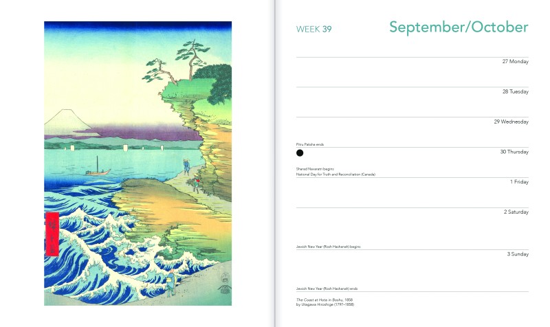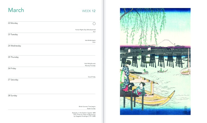 This desk diary is filled with a visually dazzling array of woodblock prints from masterful Japanese artists. The artworks feature dramatic rocky cliffs, natural beauty and mountainous landscapes, all created in a mesmerizing style and displayed with vibrant colours. Get a sense of their work with this week-to-view desk diary filled with their myriad prints. Printed on FSC-certified paper.