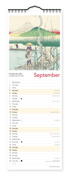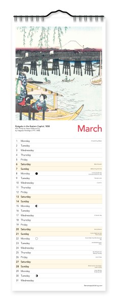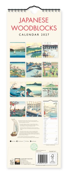 This slim calendar is filled with a visually dazzling array of woodblock prints from masterful Japanese artists including Utagawa Hiroshige. The artworks feature dramatic rocky cliffs, natural beauty and mountainous landscapes, all created in a mesmerizing style and displayed with vibrant colours. Printed on FSC-certified paper, with plastic-free packaging.