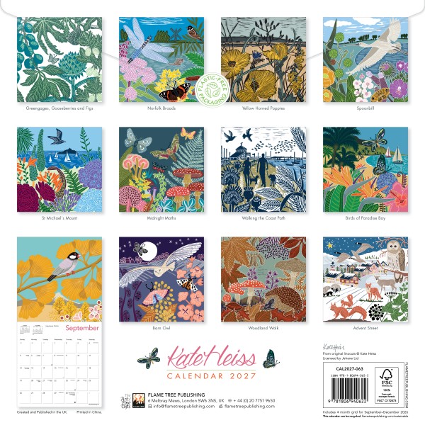 Kate Heiss is a contemporary British Printmaker who creates limited-edition screen prints and linocuts on paper. Kate studied at the Royal College of Art, graduating with an MA in Textile Design in 1997. She then worked as a Textile Designer across a wide range of fashion brands before setting up her own Printmaking Studio in 2011. Kate creates dynamic, vibrant, illustrative prints that are inspired by her love of nature. She draws inspiration from the flowers and birds in her garden, rural landscapes and her love of bold, colourful floral patterns found in textiles. Her work is handmade in her studio in Hertfordshire and is regularly exhibited across the UK. This wall calendar features beautiful reproductions of a fresh new range of works, from wistful views to still life pieces bursting with colour, now accompanied by words from the artist herself. The datepad features previous and next month’s views. Printed on FSC-certified paper, with plastic-free packaging.