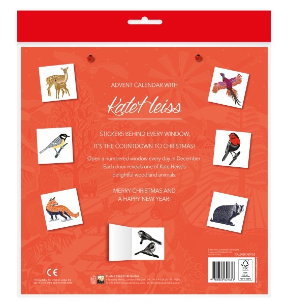Enjoy the countdown to Christmas! Open a numbered window every day in December until the big day and reveal a seasonal sticker to help you get in the festive spirit! This gorgeous advent calendar features the work of British printmaker Kate Heiss, who creates dynamic, vibrant, illustrative prints that are inspired by her love of nature. With an evocative winter countryside scene on the cover, each door reveals one of Kate Heiss’s delightful woodland animals. Printed on FSC-certified paper.