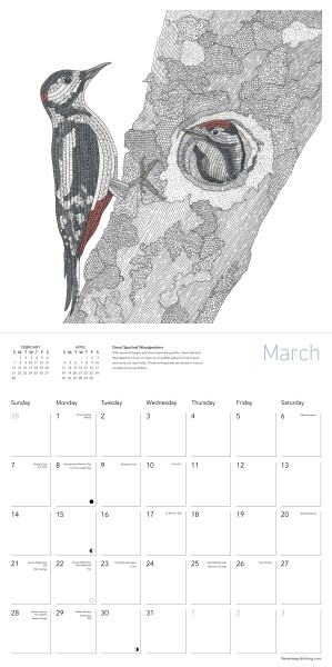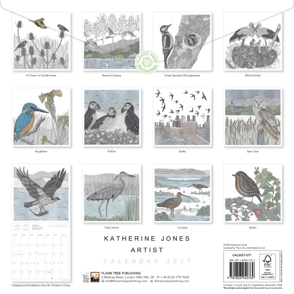 Katherine Jones is an award-winning architect and artist based in Cardiff. Drawing on 14 years of architecture experience, her detailed pen-and-ink commissions are made up of intricate line work that creates an unusual and rich tapestry of patterns. Each of her pieces consider the wider picture, but she also loves the smaller detail. She has created commissions for all sorts of organizations, but her love and passion for wildlife mean that particularly close to her heart is the work carried out for Tir Natur, a Welsh rewilding charity, who are working towards creating the largest rewilding site in Wales. With a selection of 12 beautiful artworks featuring a range of birds in their natural habitats, this calendar showcases Katherine's skill and vision. Informative text accompanies each work, and the datepad features previous and next month’s views. Printed on FSC-certified paper, with plastic-free packaging.