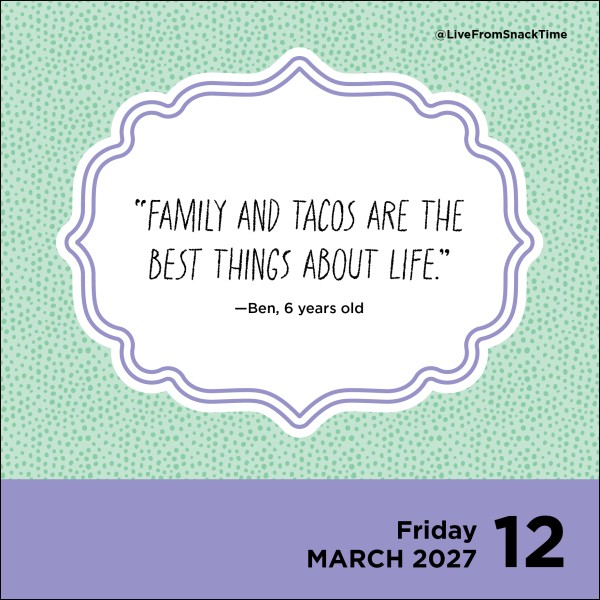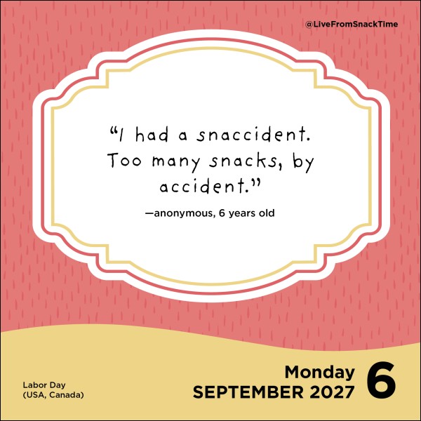 Based on the charming and hugely popular Instagram account, the Live from Snack Time: Hilarious Truths from Kids Everywhere 2027 Day-to-Day Calendar is your front-row seat to the wonderfully weird, wildly wise, and irresistibly adorable things kids say. Each daily page features a real quote from a child—unexpected and guaranteed to brighten your day. Whether it’s a hilarious misunderstanding, a surprisingly deep observation, or just pure silliness, these tiny truths will make you laugh, reflect, and fall in love with childhood all over again. Even better, you can join the fun: a QR code on the back of the calendar lets you easily submit your own funniest kid quote for a chance to be featured on the Instagram account or in the 2028 calendar.