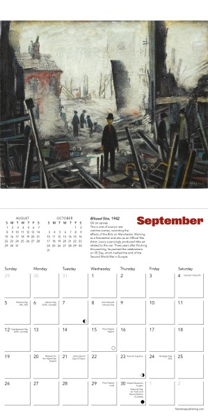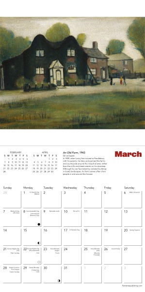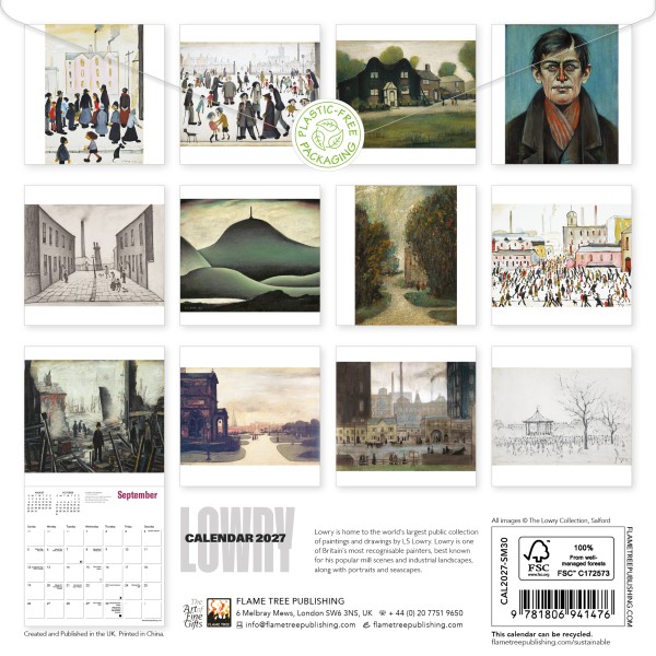 Renowned for his paintings of the industrial towns of North West England, Lowry had a distinctive and enchanting style. In association with The Lowry, which houses over 400 of Lowry’s works, this exceptional mini wall calendar portrays a selection of 12 works ranging from urban landscapes teeming with his iconic ‘matchstick men’ to haunting unpopulated scenes. Informative text accompanies each work in this mini wall calendar and the datepad features previous and next month’s views. Printed on FSC-certified paper, with plastic-free packaging.