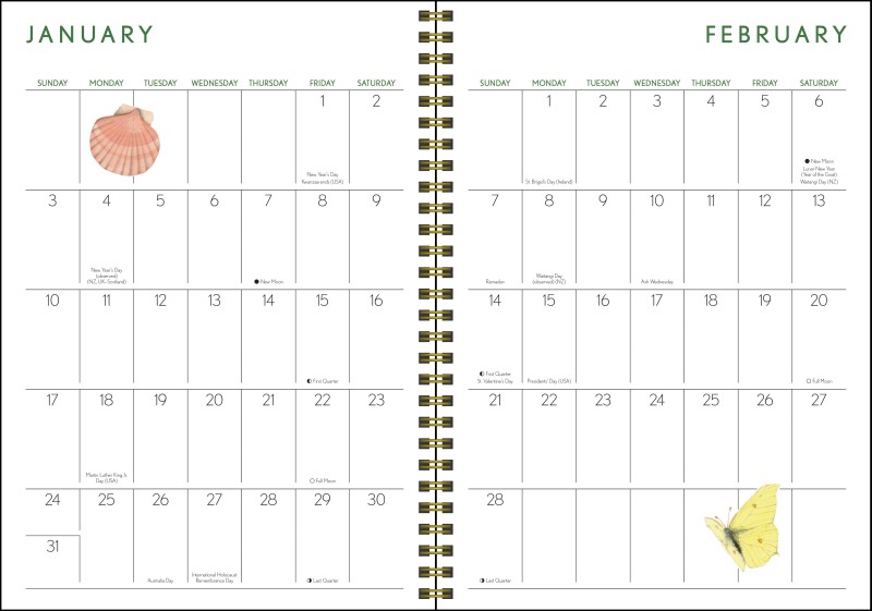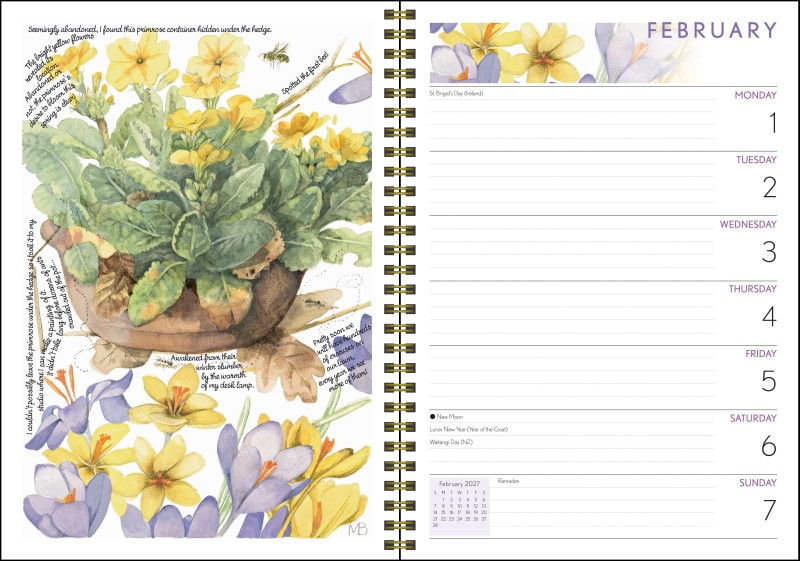 Stay organized and inspired all year long with the Marjolein Bastin Nature’s Inspiration 2027 Monthly/Weekly Engagement Calendar. Designed as a window into the artist's personal sketchbook, each weekly spread spans two pages: one side featuring a full-color watercolor of birds, blooms, or seasonal landscapes, and the other offering lined space for notes, reminders, and appointments. More than just a planner, this engagement calendar blends Bastin's delicate watercolors with her thoughtful observations, anecdotes, and natural history details about the plants and animals she illustrates. Practical yet beautiful, it's the perfect desk or travel companion for anyone who treasures nature, creativity, and mindful organization.