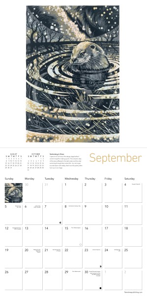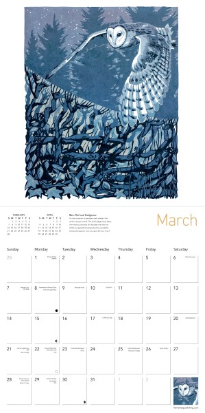 Martin Truefitt-Baker is a fine art printmaker and painter living in the Brecon Beacons national park, South Wales, UK. His linocut prints are of the animals he has seen on his walks through the local landscape, mostly within just a couple of miles of his home. Martin always tries to catch some of the magic in the way the animal moves and lives within its environment. The beautiful Usk valley, rough mountainsides, twisted trees, wild flowers and busy insects fill the backgrounds of his prints. This wall calendar features graceful owls, foxes, badgers, otters, swallows and more. Insightful text form the artist himself accompanies each work and the datepad features previous and next month’s views. Printed on FSC-certified paper, with plastic-free packaging.