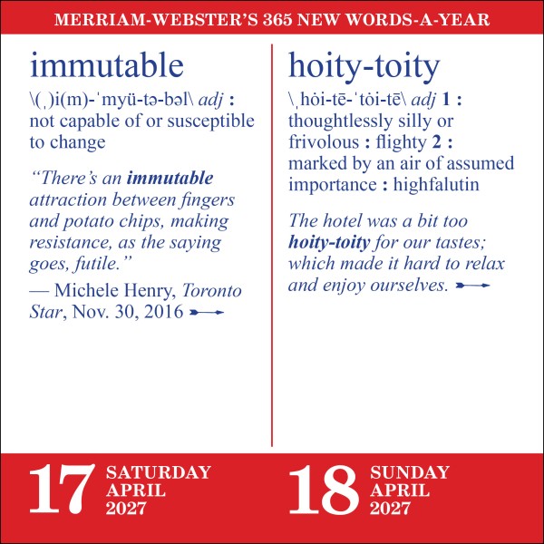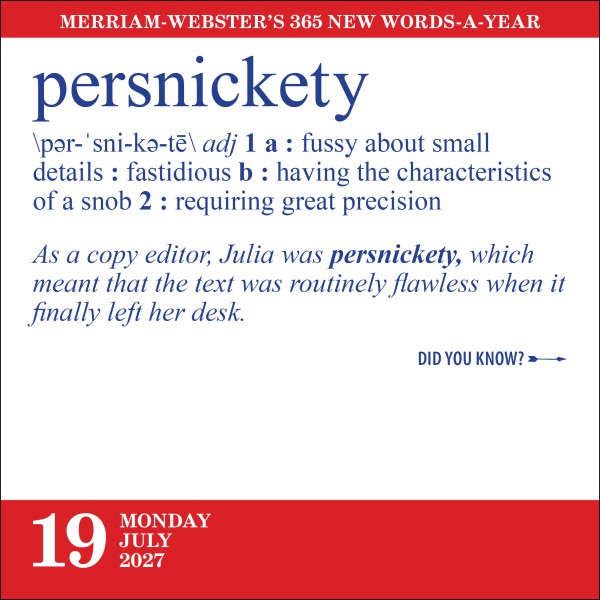 Elevate your vocabulary and spark your curiosity with Merriam-Webster's 365 New Words-A-Year 2027 Day-to-Day Calendar. Each daily page features a new word, the definition, a pronunciation key, and a sample sentence, and the back of the page features a detailed description of the word. Weekend pages have two words each, so you truly get 365 new words! Whether you're a logophile or just love learning, this calendar turns every day into a linguistic adventure.
