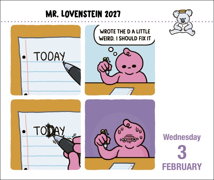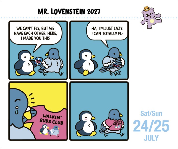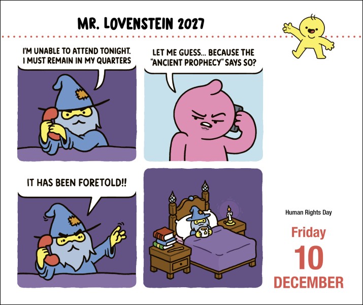 Finally, a calendar made for the sarcastic weirdos of the world. Don’t let the cute and colorful art fool you. The Mr. Lovenstein 2027 Day-to-Day Calendar is brimming with dark humor and painfully relatable characters. A wizard uses an “ancient prophecy” as an excuse to bed rot instead of going out. “Hand wash only” clothing must survive the laundry gauntlet (AKA washing machine) or perish. A cute penguin invites his fellow “flightless” pigeon friend to join the “walkin’ buds club.” (Nobody tell him pigeons are just lazy.) Wholesome, heartwarming moments make the hilarious absurdities hit even harder. You’ll never predict what the next day will bring. Complete with secret bonus panels on the back of every page, you’re guaranteed to laugh or sigh at least twice a day.