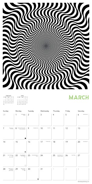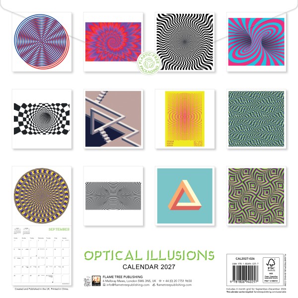 Mind-bending and hypnotic, optical illusions fascinate and astonish. This calendar features 12 striking illusions that boggle the brain and trick the eye, from moving patterns to image paradoxes. Fun and engaging for adults and children alike, this vibrant calendar is sure to be a hit with curious minds of any age. The datepad features previous and next month’s views. Printed on FSC-certified paper, with plastic-free packaging.