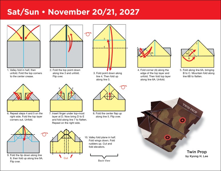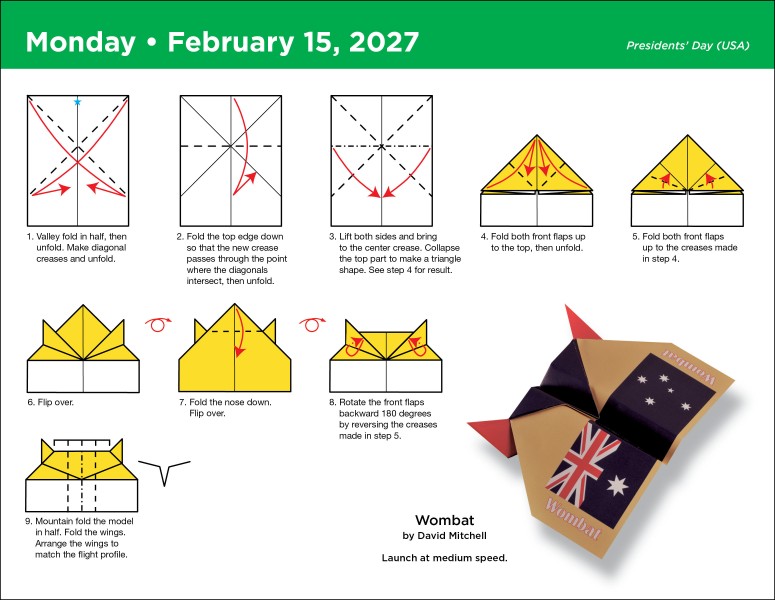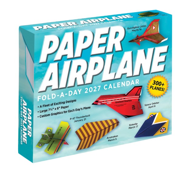 Origami designer David Mitchell and paper-airplane expert Kyong Lee combine forces to bring you endless flights of fun. The calendar includes more than 300 dynamic paper airplane designs from 40 original models based on real-life military planes—such as MiGs, fighter jets, and drones—plus commercial aircraft and others. Large size paper folds into airplanes big enough to really fly.