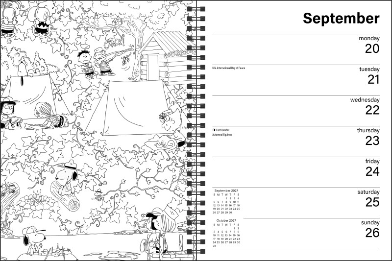 The PEANUTS®2027 Monthly/Weekly Coloring Calendar with Stickers to Color combines practical planning with creative fun. Each week features a charming black-and-white illustration of the PEANUTS® gang ready for you to color—perfect for stress relief, mindfulness, or simply adding joy to your day. With plenty of space to jot down appointments, meetings, and notes, this calendar is a functional gift for lifelong fans and coloring enthusiasts alike! And for extra fun, it also includes a sheet of stickers for you to color your way!