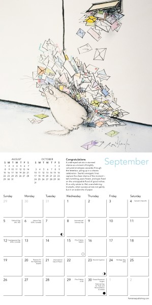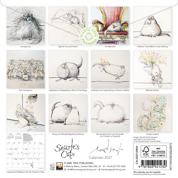 Ronald Searle, the renowned British artist and satirical cartoonist, left an indelible mark on the world of illustration with his distinctive style and whimsical creations. His passion for drawing was born and cultivated in his native Cambridge. This official mini wall calendar features 12 of his artworks focusing on weird and wonderful cats. From sly, mischievous grins to imperious glares, Searle’s Cats run the gamut of feline emotions and attitudes, accompanied by witty captions. Informative text sits alongside each work in this mini wall calendar and the datepad features previous and next month’s views. Printed on FSC-certified paper, with plastic-free packaging.