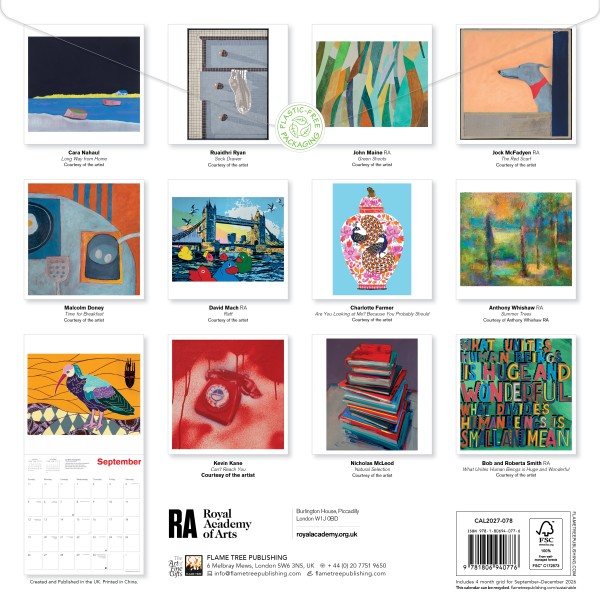 Featuring the work of 12 RA-exhibited artists, many of whom are Royal Academicians (the leading talents Cara Nahaul, Ruaidhri Ryan, John Maine RA, Jock McFayden RA, Malcolm Doney, David Mach RA, Charlotte Farmer, Anthony Whishaw RA, Kevin Kane, Nicholas McLeod and Bob and Roberta Smith), this wall calendar is filled with vibrant and original art, revealing the beauty of the everyday and the wonder of nature. The datepad features previous and next month’s views. Printed on FSC-certified paper, with plastic-free packaging.