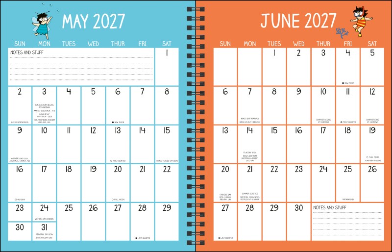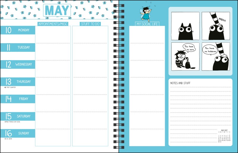With three separate planning columns on each weekly spread––one for appointments, one for “to-dos,” and another for social activities––the colorful organizer assists in making plans, meeting deadlines, and balancing life. It also entertains with its weekly comics on relatable topics such as fur baby cats and dogs, tribulations of an introvert, relationship challenges, and more.