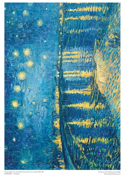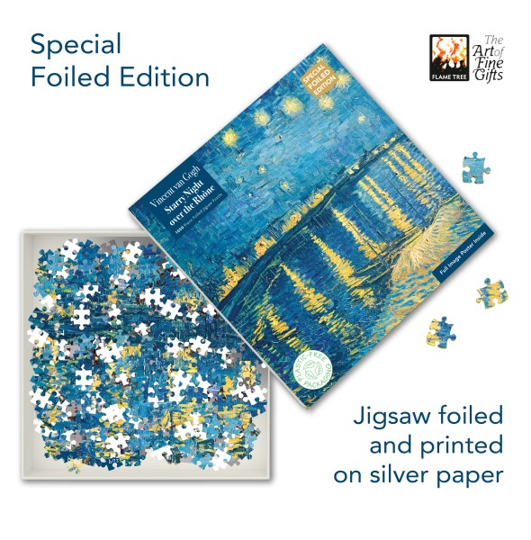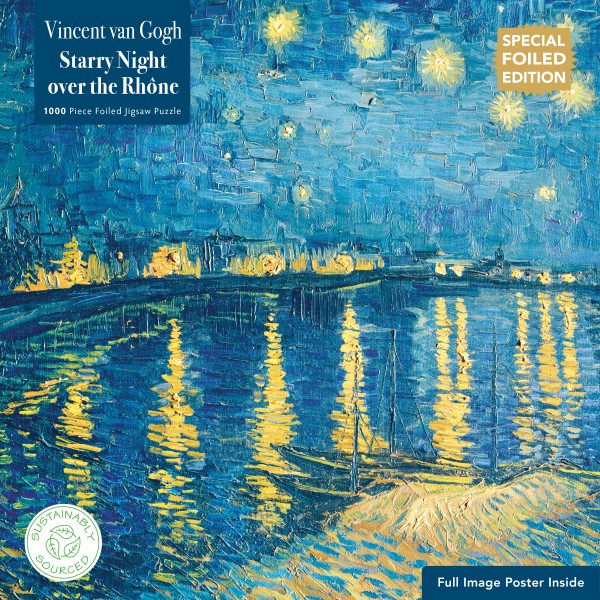 Part of a new, exciting series of special-edition, sustainable and earth-friendly jigsaw puzzles that feature powerful and popular works of art. This high-quality, 1000-piece jigsaw puzzle from Flame Tree is made with all FSC-certified paper, board and bag, with sturdy pieces and no shrink-wrap. Both the box and the puzzle are printed on foiled paper, with foil detailing added to stunning effect, heightening the beauty of Vincent van Gogh's iconic Starry Night Over the Rhône. Intended for adults and children over 13 years. Not suitable for children under 3 years due to small parts. Includes an A4 poster for reference. Finished Jigsaw size 735 x 510mm / 29 x 20 ins.