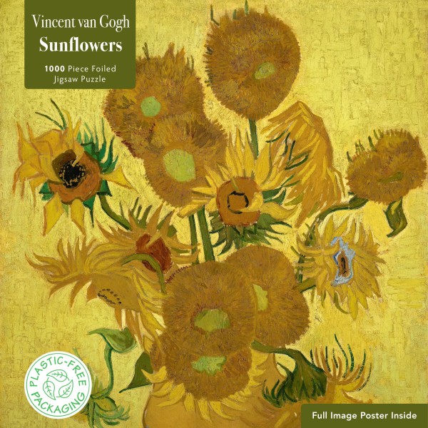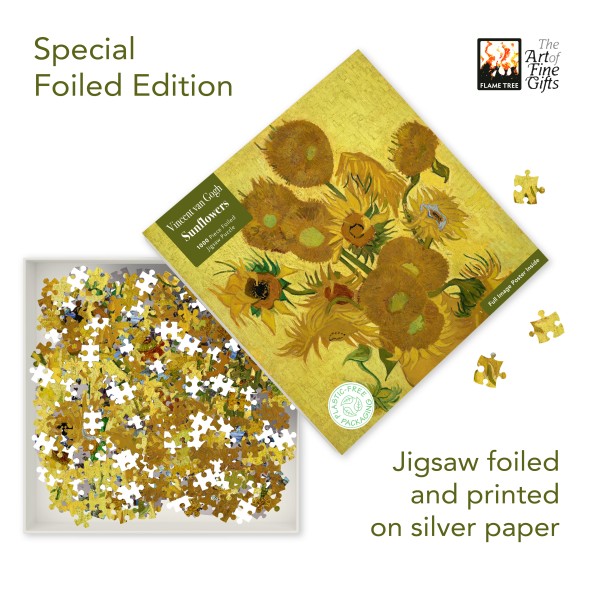 Part of a new, exciting series of special-edition, sustainable and earth-friendly jigsaw puzzles that feature powerful and popular works of art. This high-quality, 1000-piece jigsaw puzzle from Flame Tree is made with all FSC-certified paper, board and bag, with sturdy pieces and no shrink-wrap. Both the box and the puzzle are printed on foiled paper, with foil detailing added to stunning effect, heightening the beauty of Vincent van Gogh's iconic Sunflowers. Intended for adults and children over 13 years. Not suitable for children under 3 years due to small parts. Includes an A4 poster for reference. Finished Jigsaw size 735 x 510mm / 29 x 20 ins.