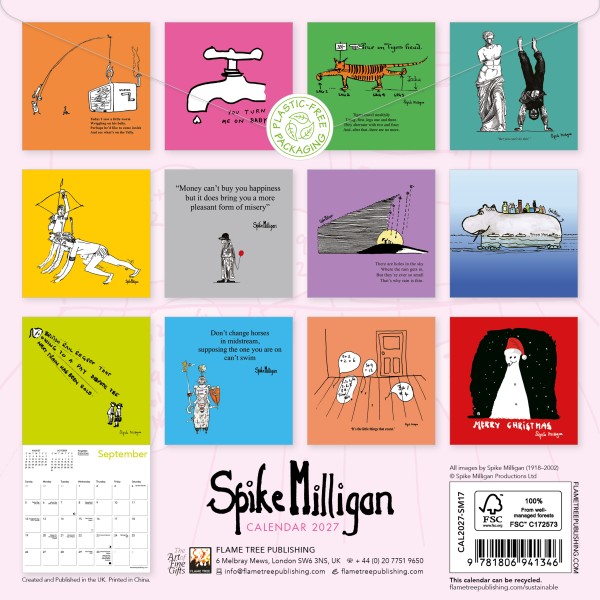 Perhaps best known as the co-creator of and writer for The Goon Show, Spike Milligan has received accolades as a comedian, musician, poet and playwright. This mini wall calendar features a selection of his hilarious cartoons. The datepad features previous and next month’s views. Printed on FSC-certified paper, with plastic-free packaging.