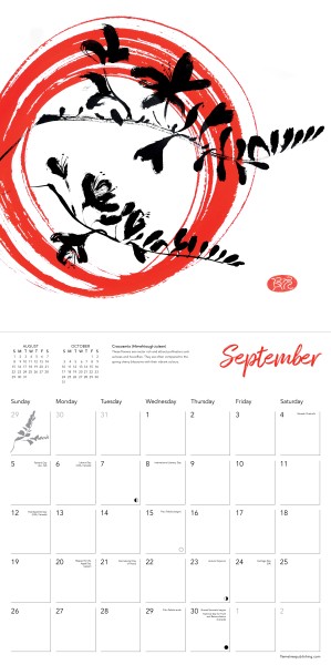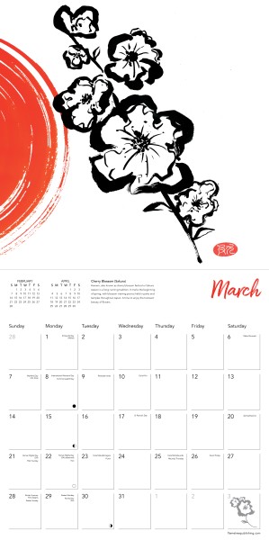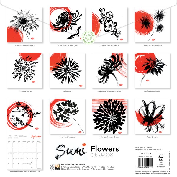 This calendar showcases the Sumi ink artwork of Regency Pugh, featuring 12 beautiful images of flower heads in simple black, anchored by bold orange brushwork. Trained in Creative Arts, followed by a career in design, illustration and art direction, Regency Pugh has studied Japanese art, culture and calligraphy for many years, both in Japan and the UK. She has developed her use of Sumi ink and Japanese brushes into an individual art style, always maintaining the simplest form and minimal line. Informative text accompanies each work, and the datepad features previous and next month’s views. Printed on FSC-certified paper, with plastic-free packaging.