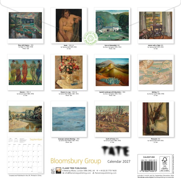 The loose collective of artists, writers and intellectuals that met around Bloomsbury and formed relationships and shared ideas have had a lasting influence on art and culture, and maintain a fascinating allure. This wall calendar features 12 varied artworks by artists who are considered key members of the Bloomsbury Group and those more associated on the fringes, from Tate's collection. From shifting and sunlit landscapes to works exploring sexuality and mortality, the artists included are: Roger Fry, Vanessa Bell, Dora Carrington, Duncan Grant and Dame Ethel Walker. Informative text accompanies each work and the datepad features previous and next month’s views. Printed on FSC-certified paper.