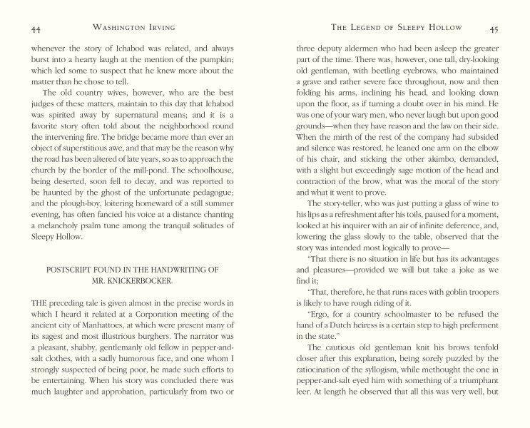 First published in The Sketch Book in 1819–20, The Legend of Sleepy Hollow tells the story of schoolmaster Ichabod Crane, who comes to live in Sleepy Hollow, a Dutch settlement near the Hudson River. It is a place that abounds with local superstitions, including one concerning a headless horseman. Crane’s eye is caught by Katrina van Tassel, the daughter of a wealthy farmer, and he starts to court her. This behaviour provokes the ire of another would-be-suitor, Brom Bones, a renowned village prankster. At a party, Crane confesses his love for Katrina, who rejects him. On his way home, he encounters the ‘horseman’, who hurls his head at Crane. Ichabod Crane is never heard of again. The only traces that remained of him were his horse, saddle, hat and a mysterious shattered pumpkin. What did happen to Ichabod Crane that night, and who was the Headless Horseman?